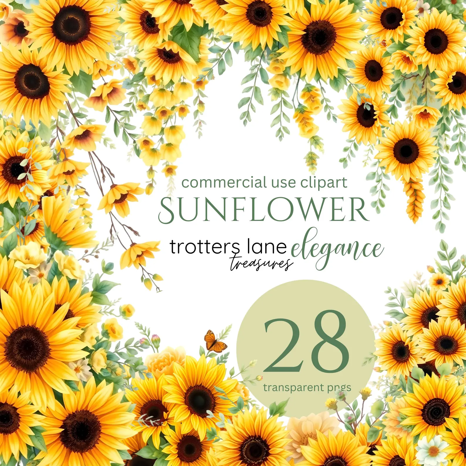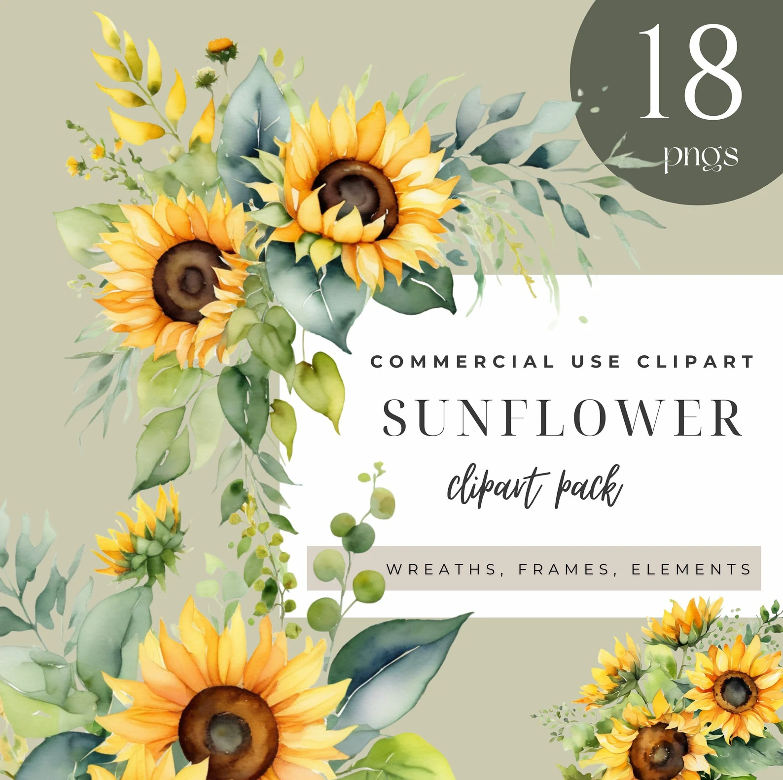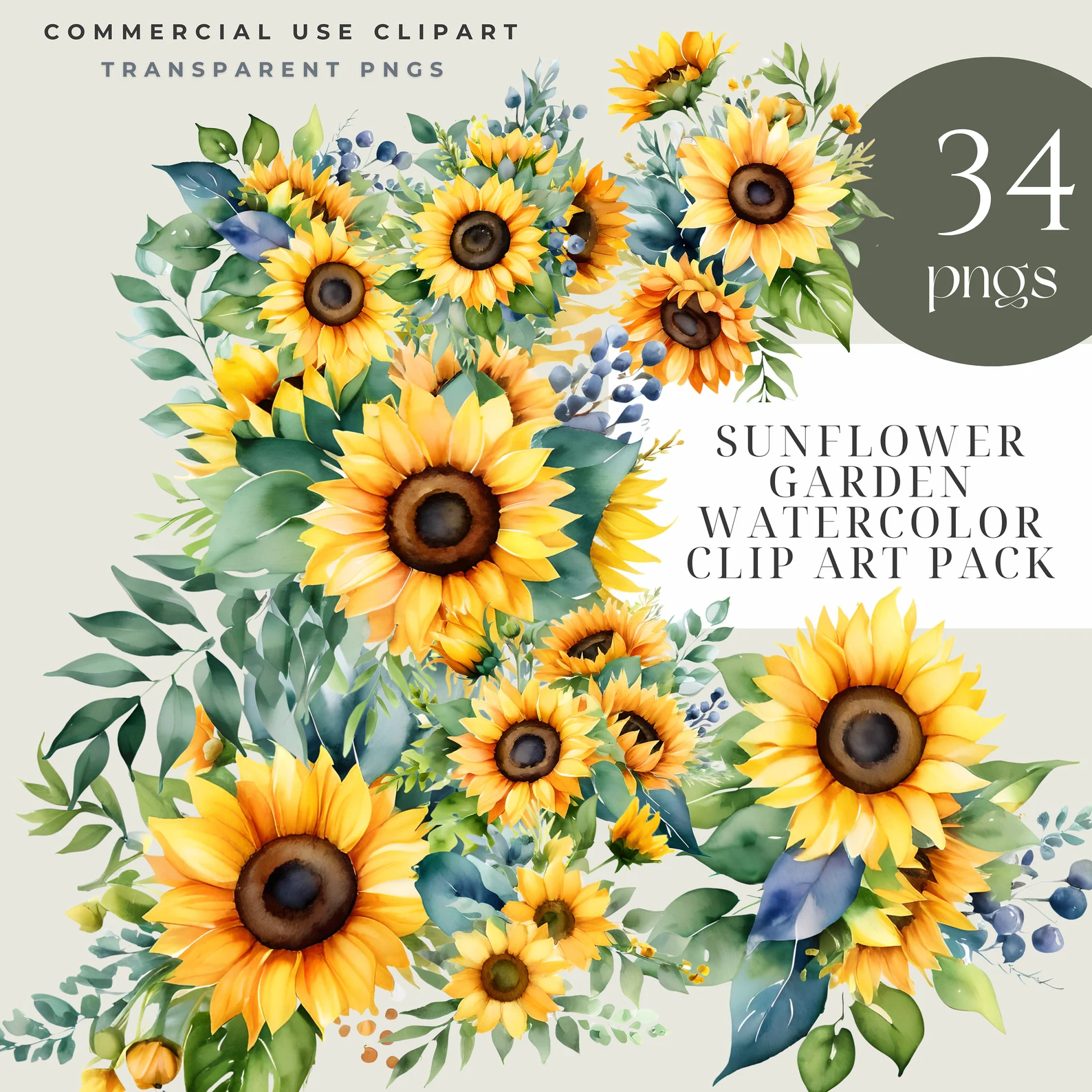 Sunflower Clipart, Sunflowers PNG, Sunflower Watercolor Clipart Pack - 34 PNGs, Sunflowers Clipart, Commercial Use, Sunflower Wreath, Flower