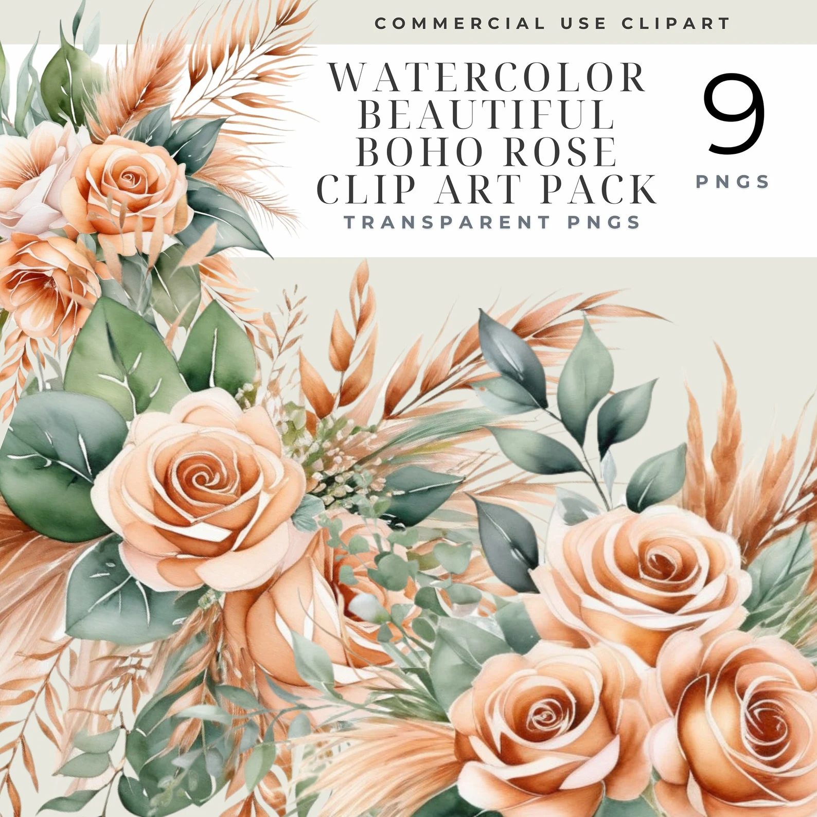 Pampass Clipart, Pampas Grass & Watercolor Rose Clipart - Boho Floral PNG Set, Wedding , Craft Scrapbooking Commercial Use Graphics
