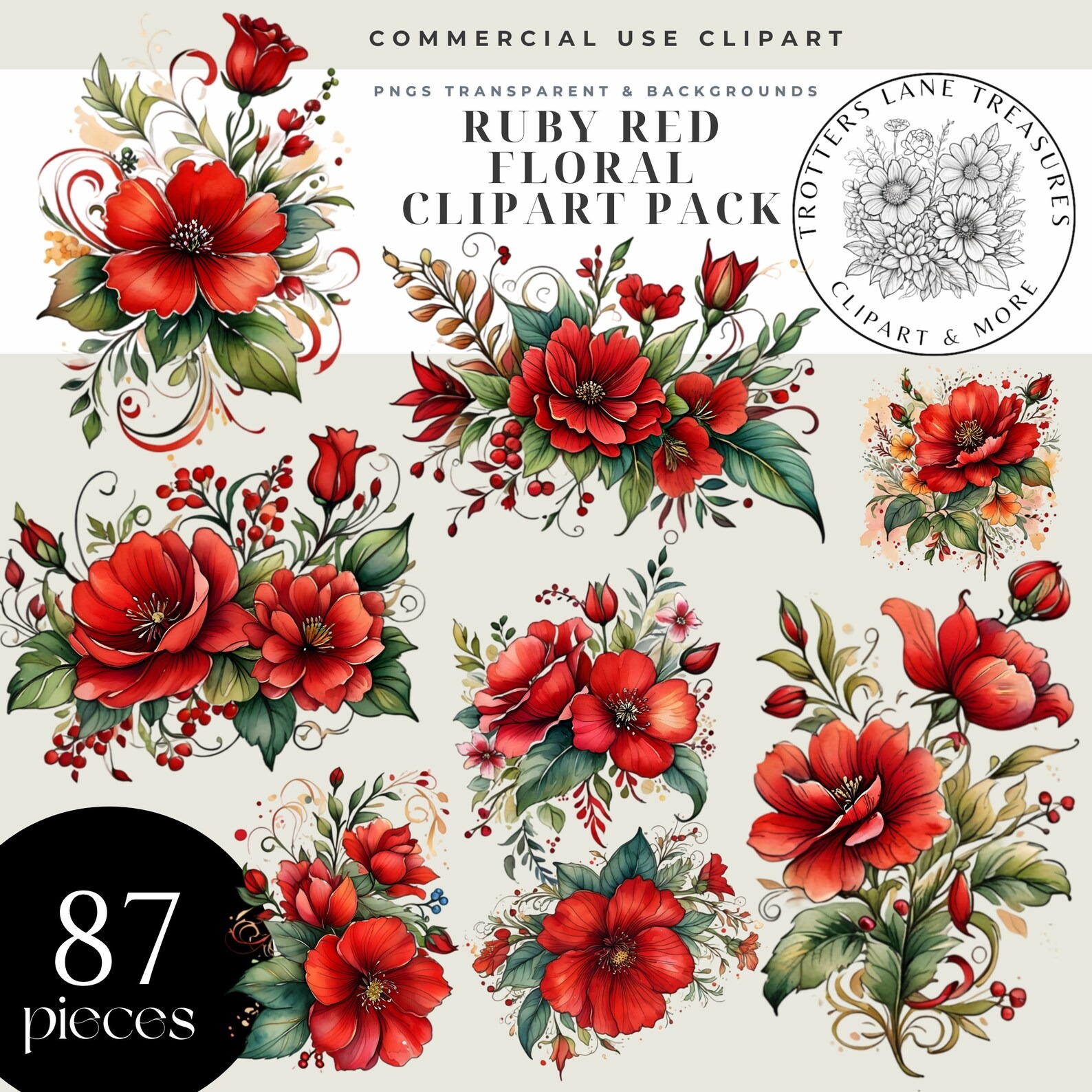 Red Floral Clipart Bundle – 87 PNGs of Ruby Red Flowers & Bouquets, Watercolor Elements for Weddings, Cards, Crafts, Commercial Use