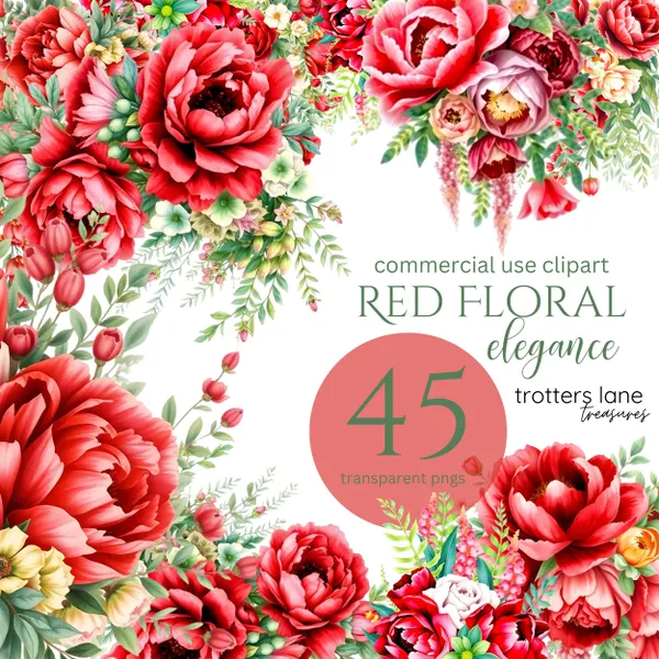 Red Floral Clipart | Elegant Watercolor Flowers, Romantic Botanical PNGs, Wedding, Peonies, Junk Journal, Flower Clipart, Shower