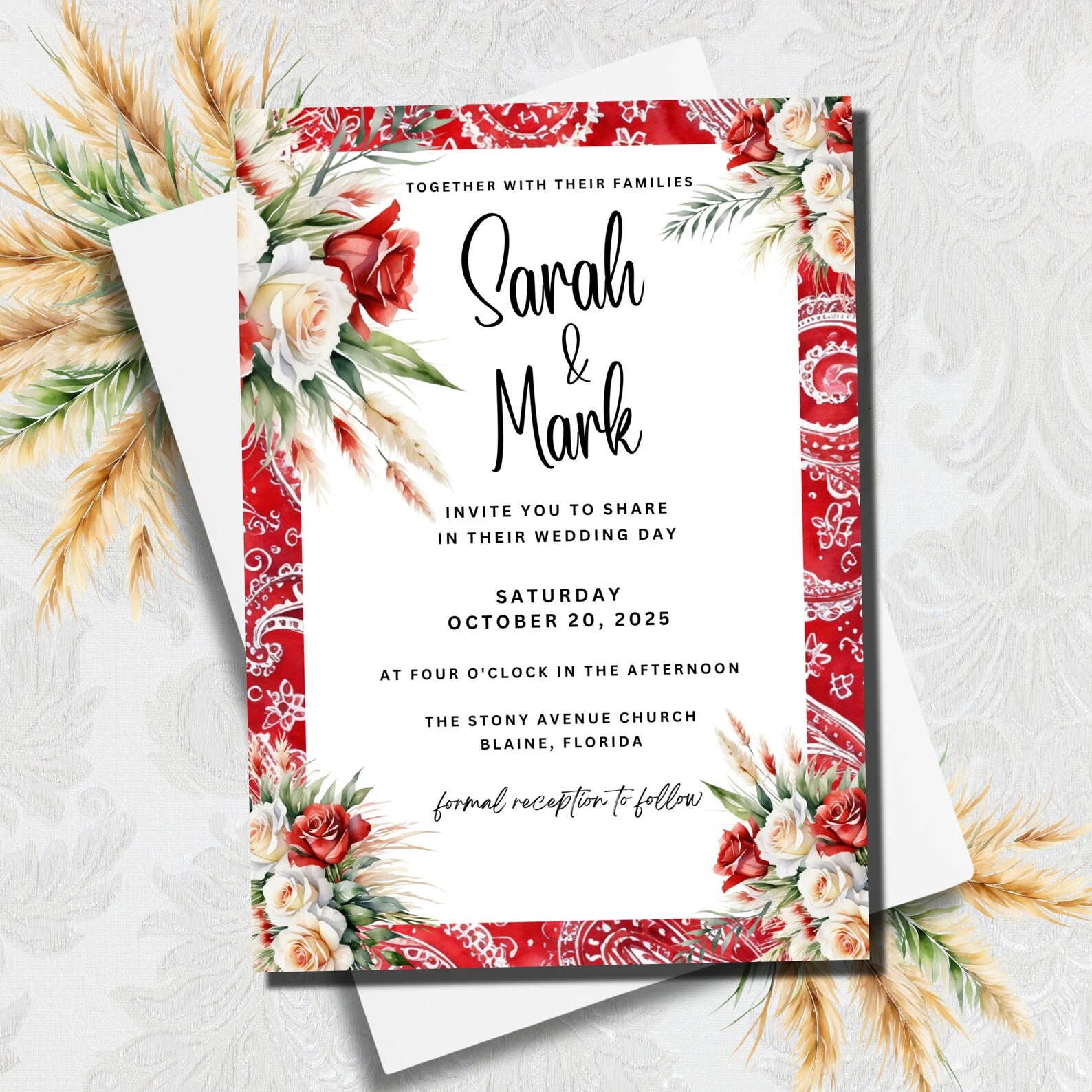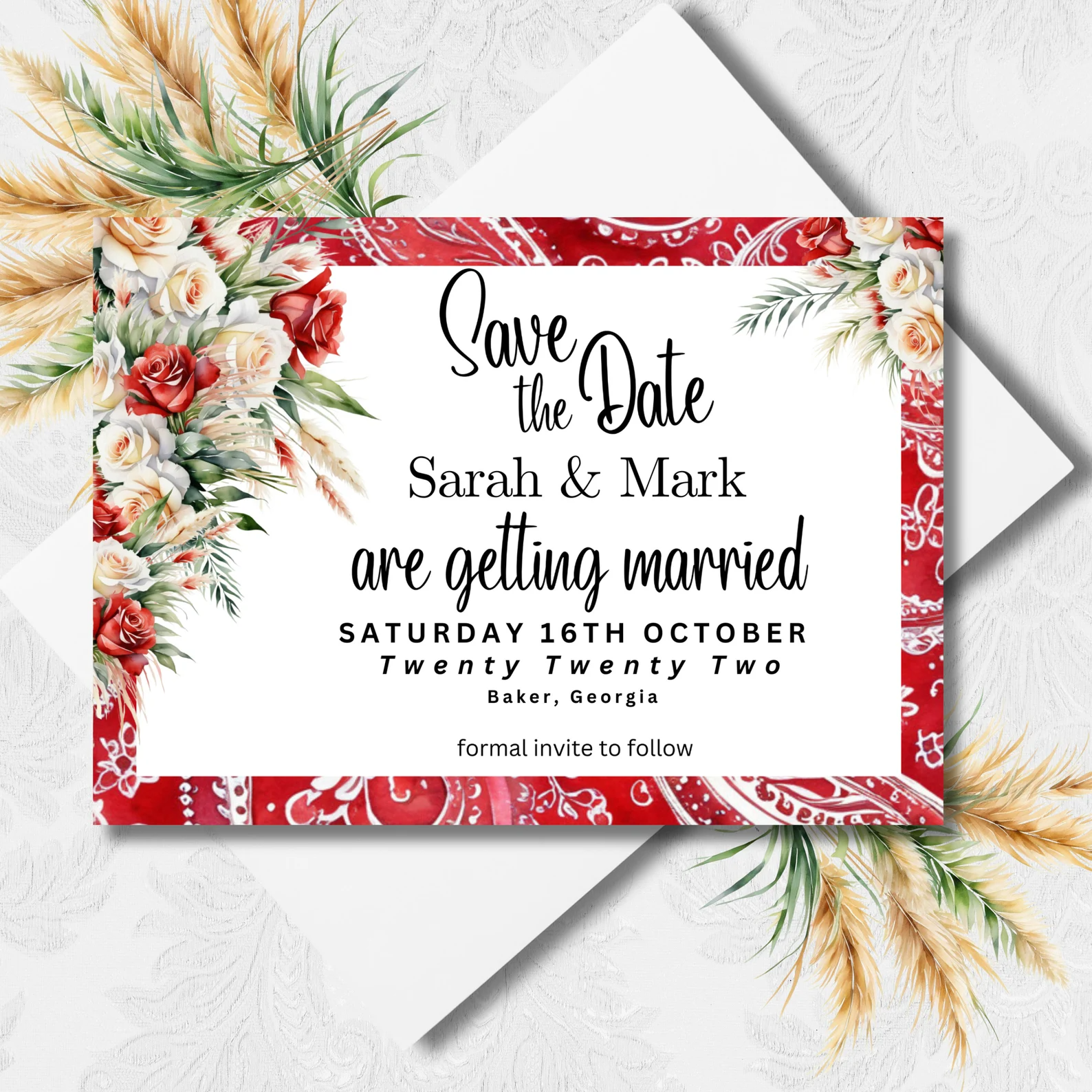 Rustic Wedding Save the Date Template - Red Paisley, DIY Wedding, Western Country Chic Invitation - Digital Download, Editable, Announcement