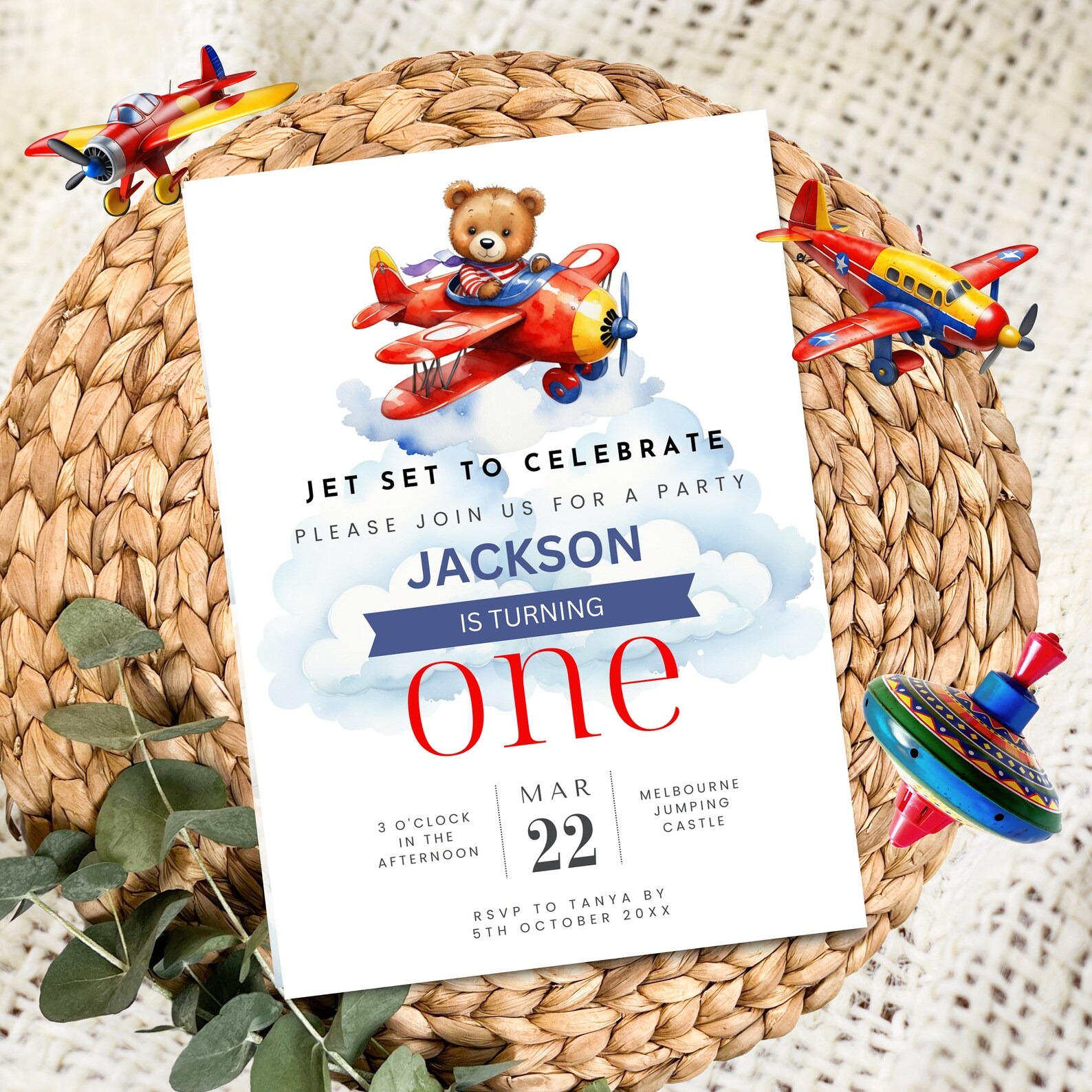 First Birthday Airplane Invitation - Editable Template, Little Pilot Party, Red Plane Birthday Invite, Instant Download