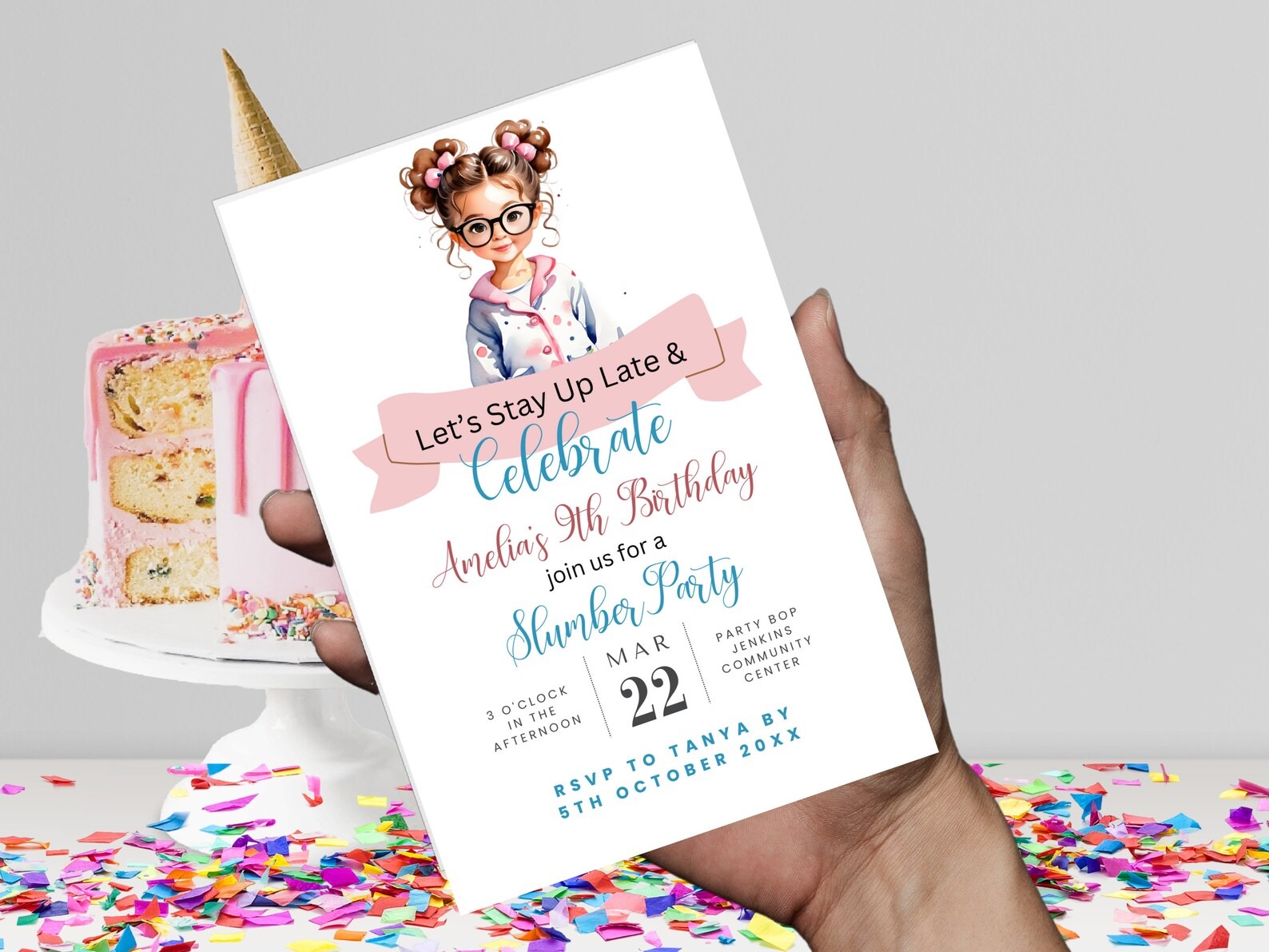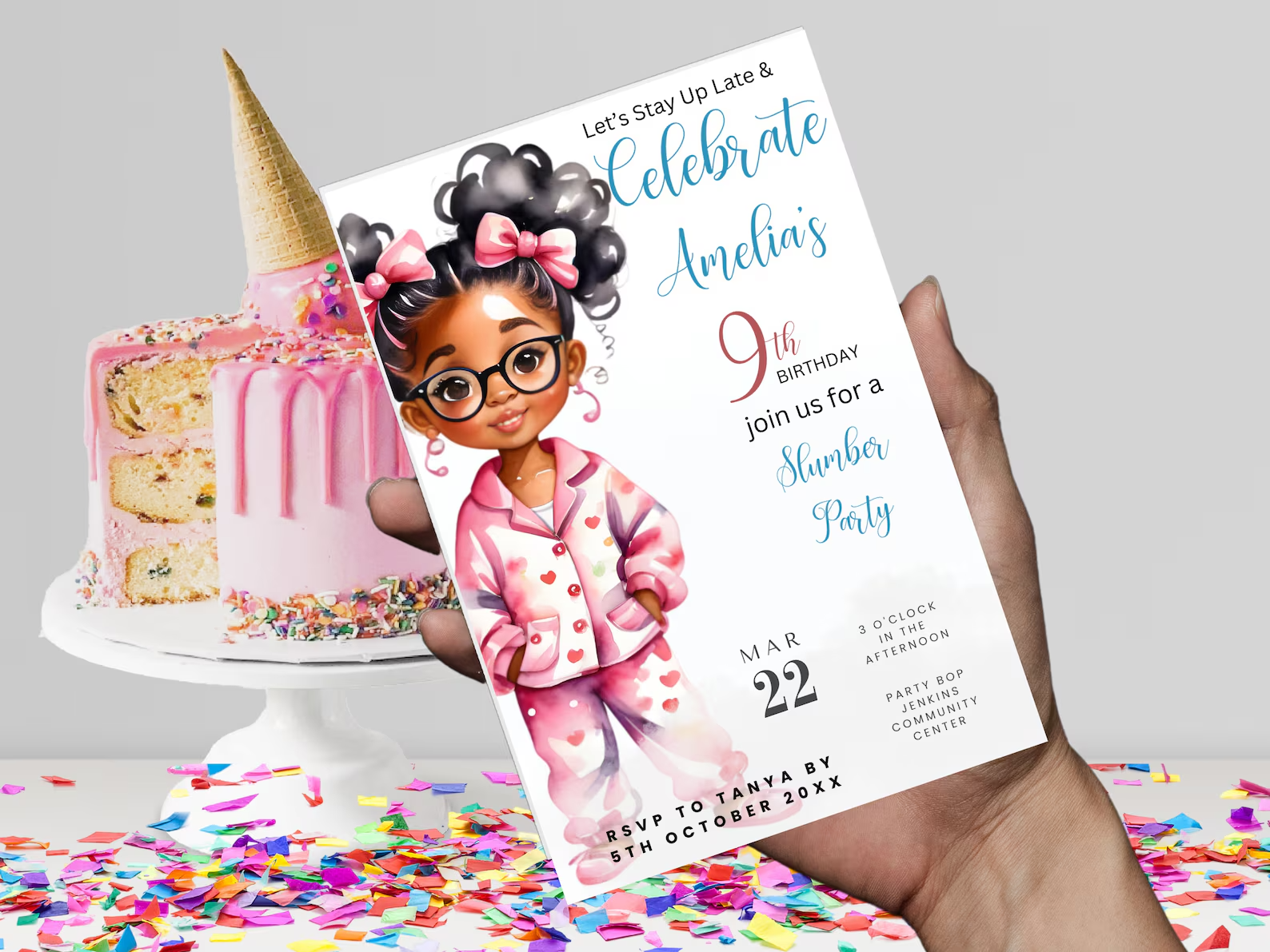 Sleepover Invitation for Girls, 9 year old girl birthday invitation, Editable Age Birthday Invite, Black Girl Birthday Invite, Printable