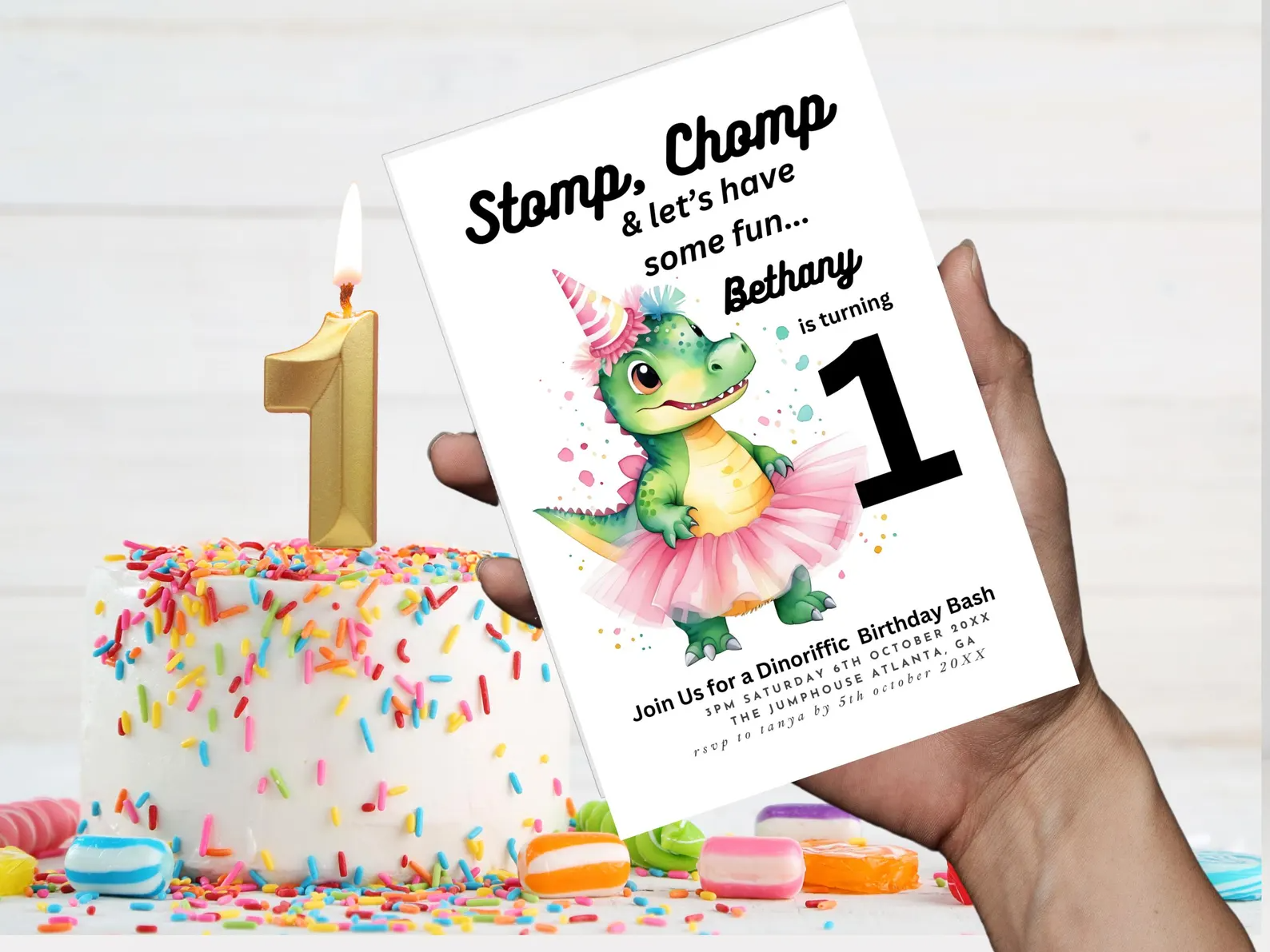 Dinosaur In Tutu Birthday Invite, Girly Dinosaur Invitation, Dinosaur With Party Hat Invitation, Pastel Dinosaur Invitation, Pastel