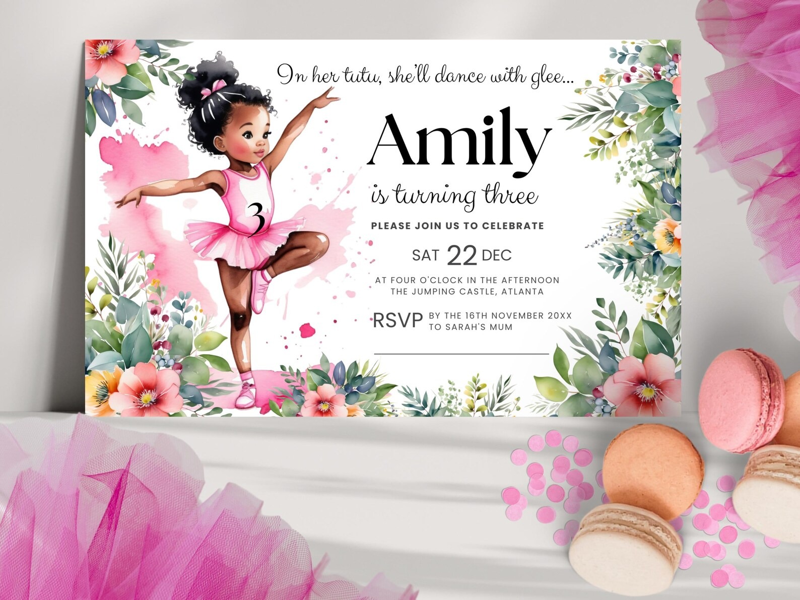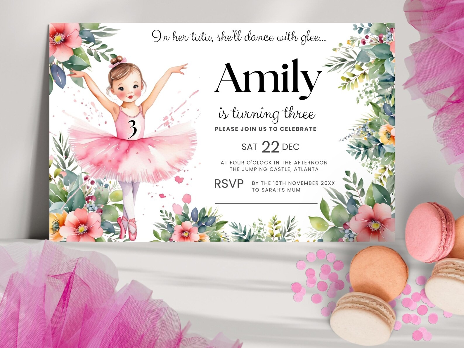 Ballerina Birthday Invitation, Three Year Old Girl Birthday Invitation. Ballet Birthday Party Invitation, Editable Template, Printable,