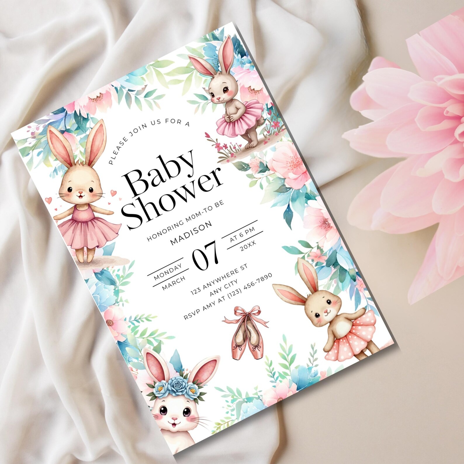 Bunny Baby Shower Invitation Template - Editable Ballet Baby Shower Invite - Floral Bunny Party Printable - Digital Download