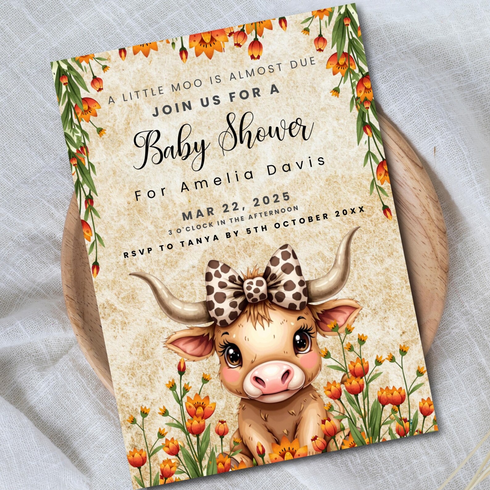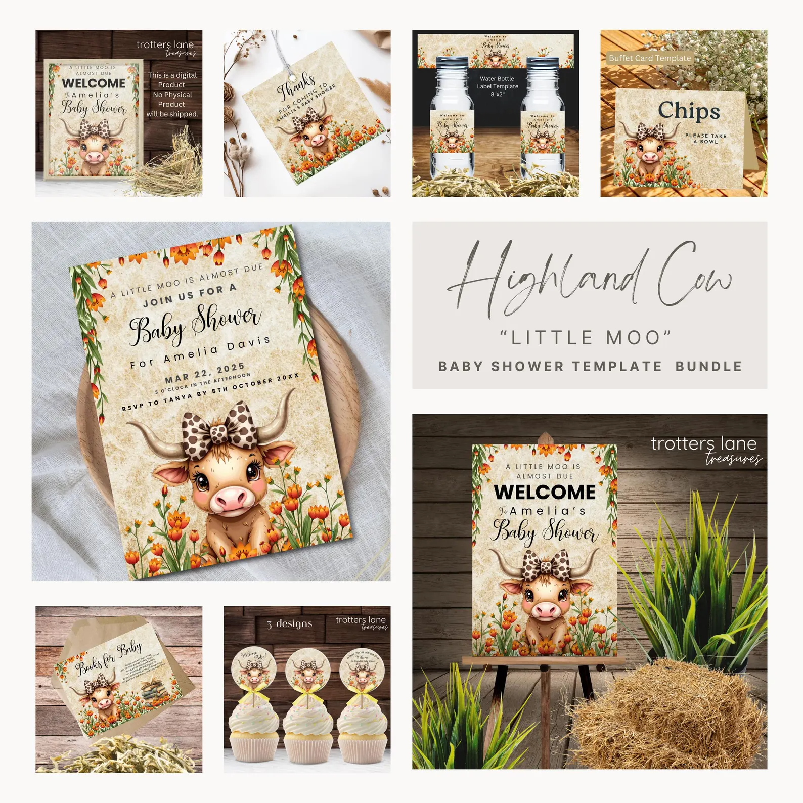 Highland Cow Baby Shower Bundle Invitations Editable Invite Set Decorations Kit Cupcake Toppers, Welcome Sign, Favor Tags, and more