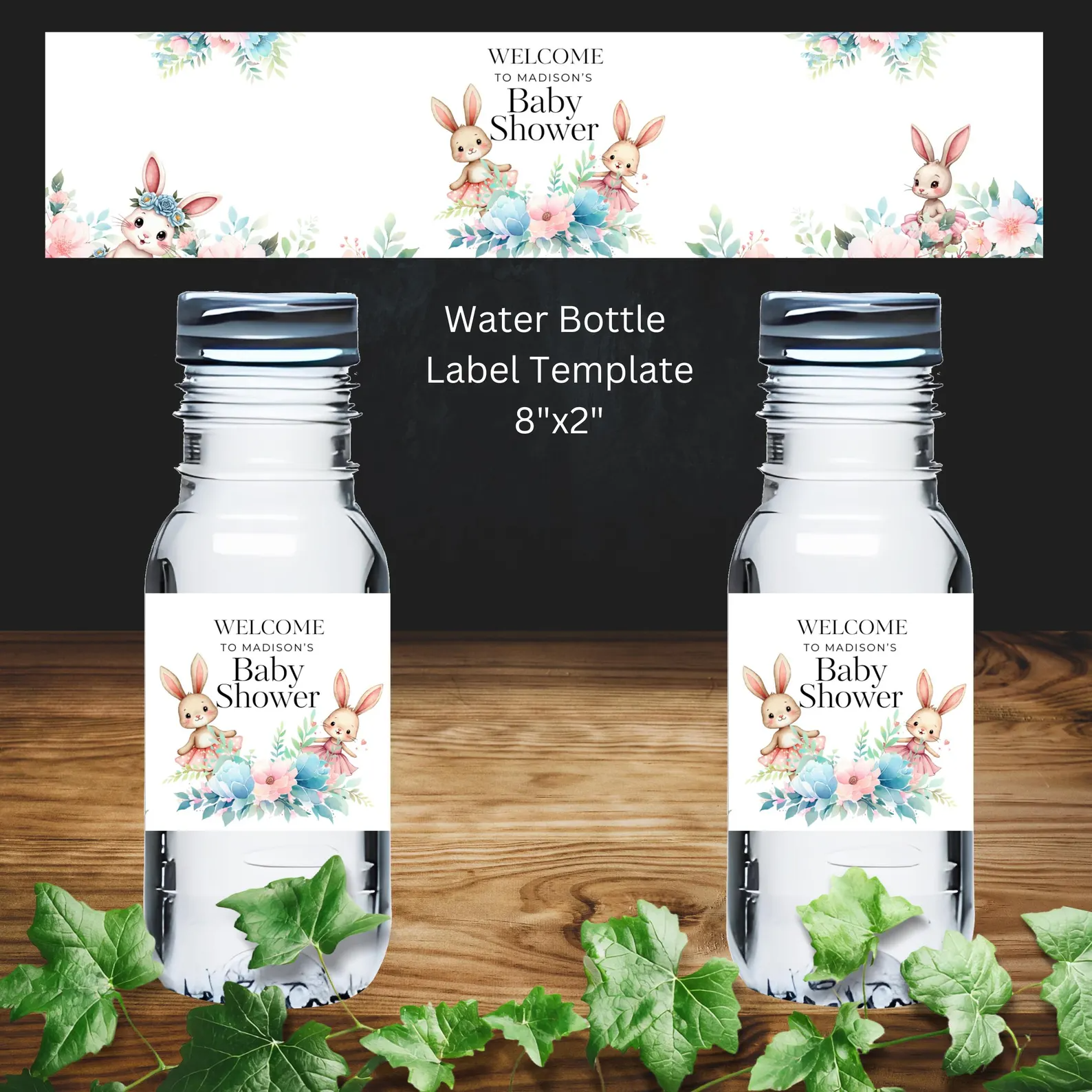 Floral Bunny Baby Shower Water Bottle Label Template | 8"x2" Editable Party Favor Wraps | Printable Baby Shower Decor, Ballet Baby Shower