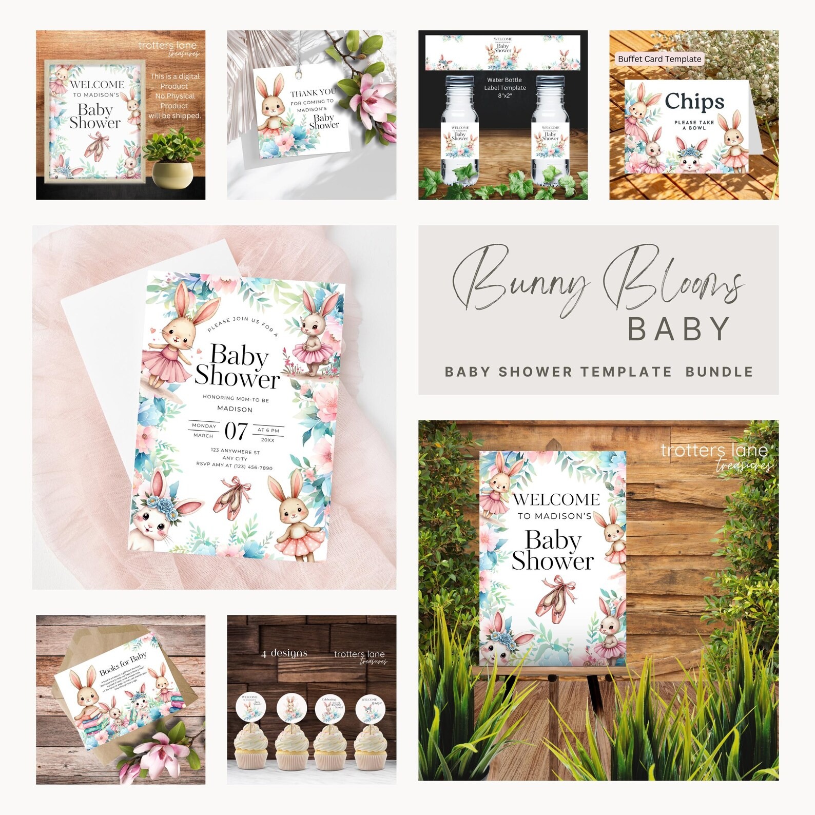 Floral Bunny Baby Shower Template Bundle | Editable Invitations & Party Decor | Rustic Spring Shower Printable Set
