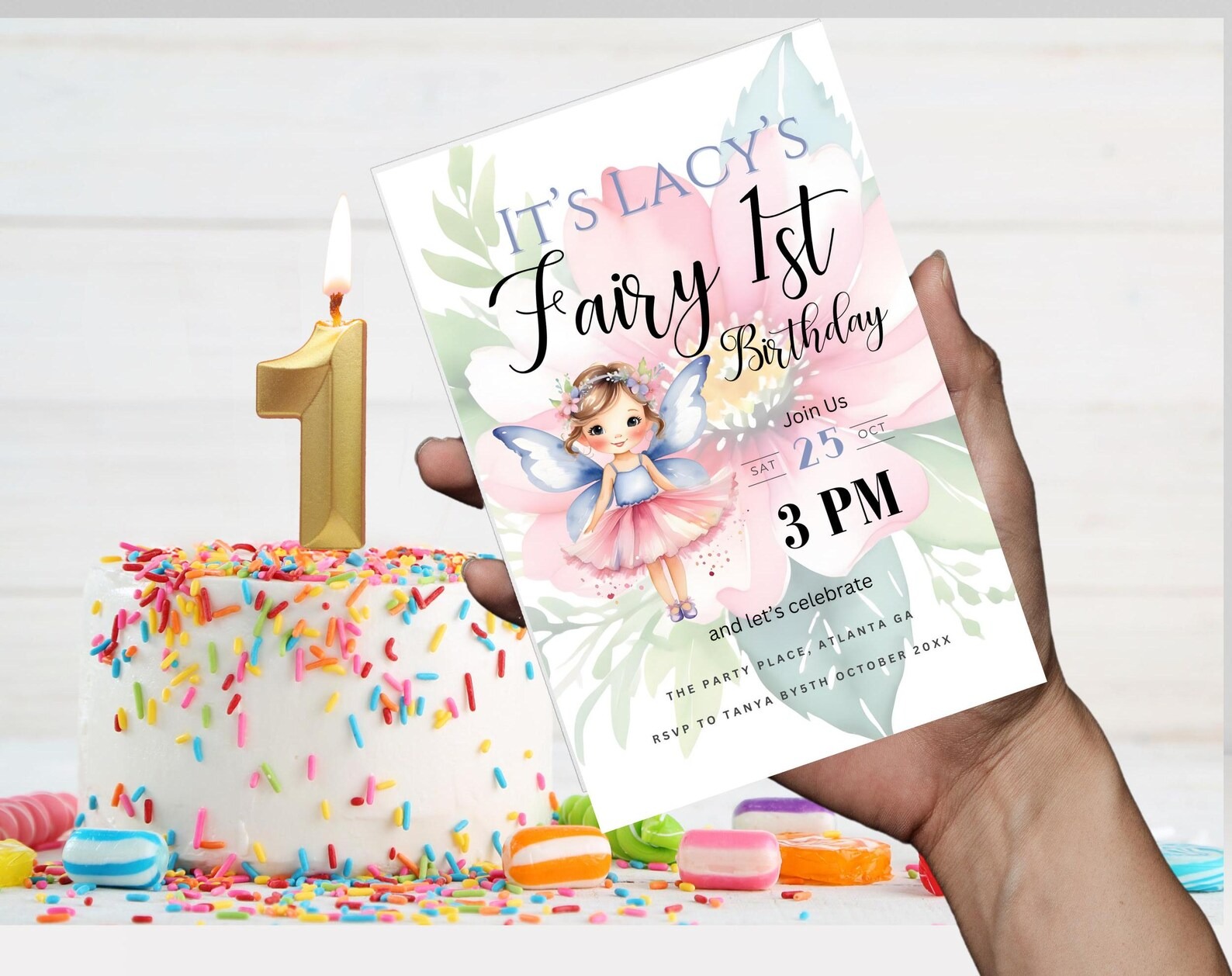Fairy First Birthday Invitation, Fairy 1st Invite, Editable Template, Download, Fairy Birthday Editable Age, Brown Hair Girl Birthday Invite